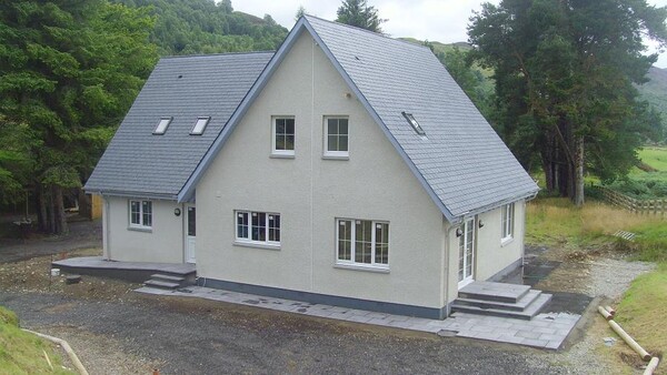 In 2009 we were contracted to do the building and joinery work on this house in Invergarry, which included making the timber frame on-site. This five bedroom, story and a half property is finished with hardwood floors throughout, oak staircase and finishings.